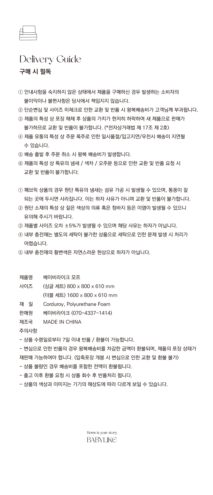 - 상품 하자, 오배송의 경우 수령일로부터 7일 이내 고객센터 접수 후 교환∙반품이 가능합니다. (교환/반품비 무료)