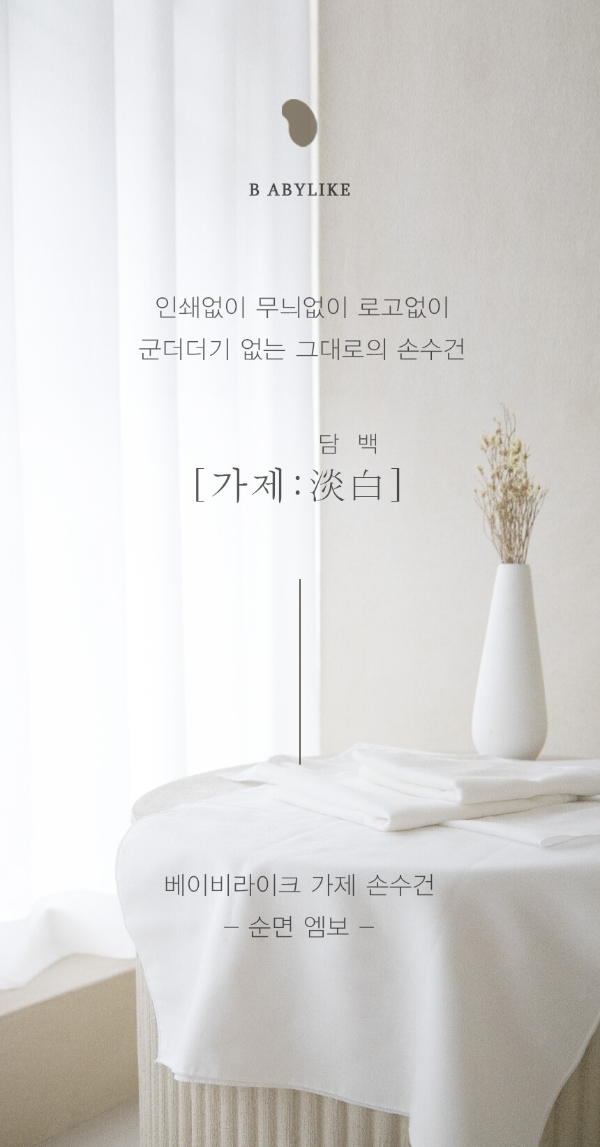 베이비라이크 순면 가제 손수건은 인쇄, 무늬, 로고 등 불필요한 군더더기들을 빼고 오직 순면 100%로 만들어졌습니다. 합성소재가 들어가지 않아 처음에는 뻣뻣한 느낌이 있을 수 있으나 세탁할 수록 유연해지고 부드러워지며 더욱 오래 사용할 수 있습니다.