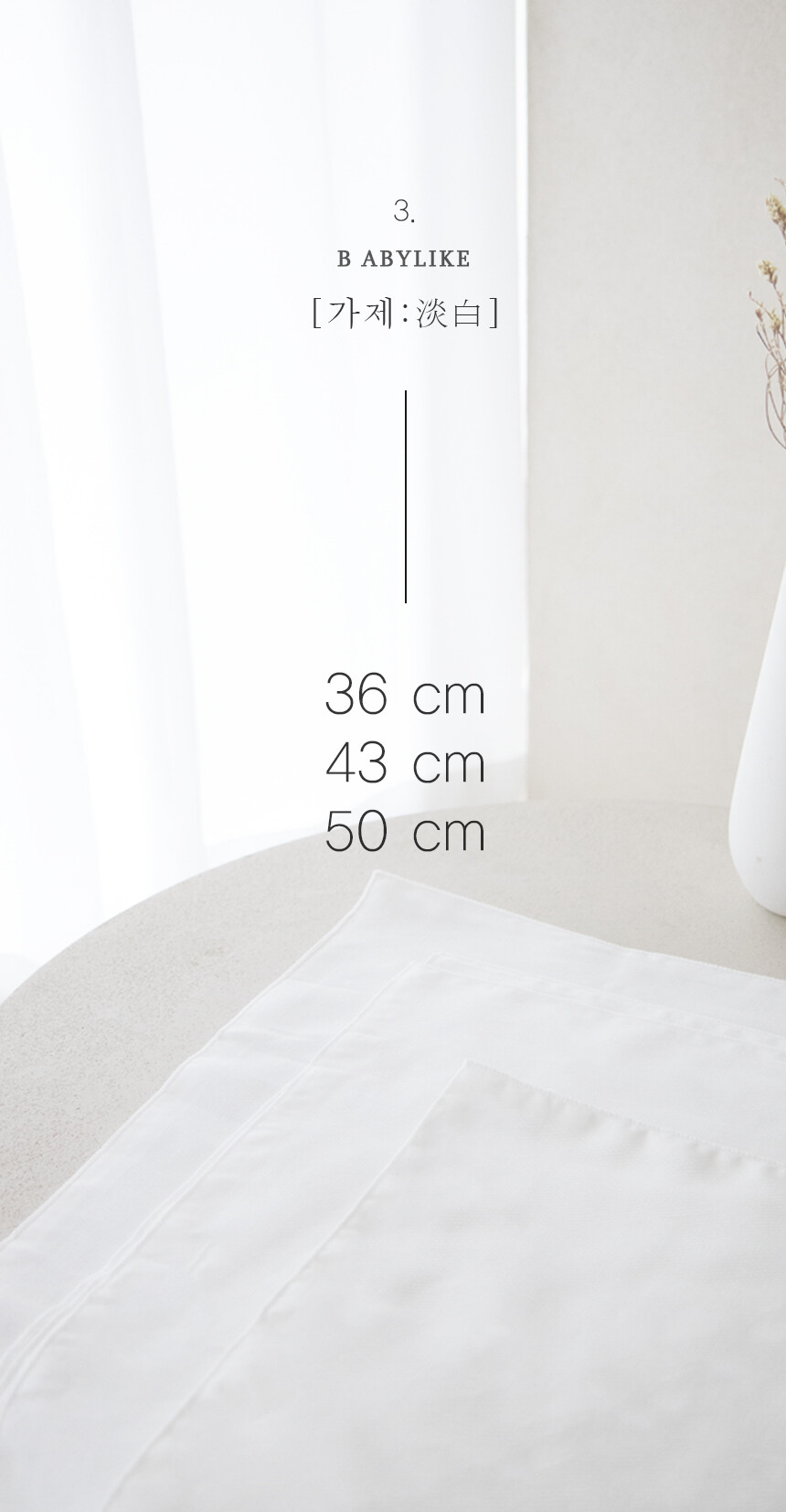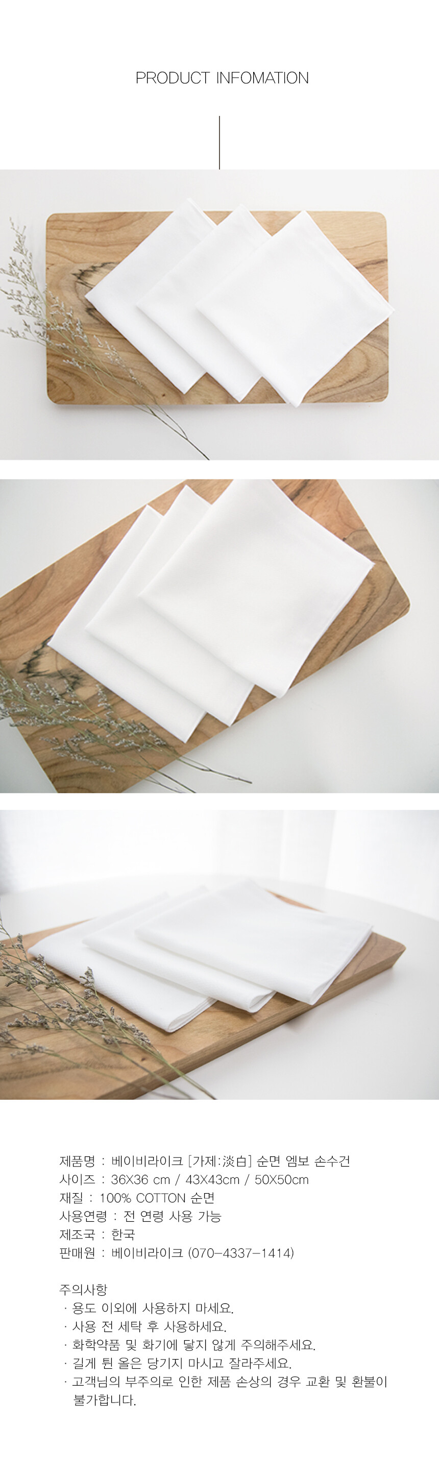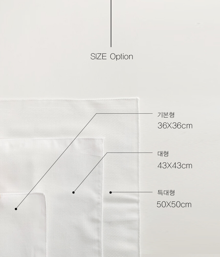 베이비라이크 순면 가제 손수건은 36cm / 43cm / 50cm 3가지 사이즈가 준비되어 있습니다. 용도에 따라 적절하게 선택하여 사용하세요.